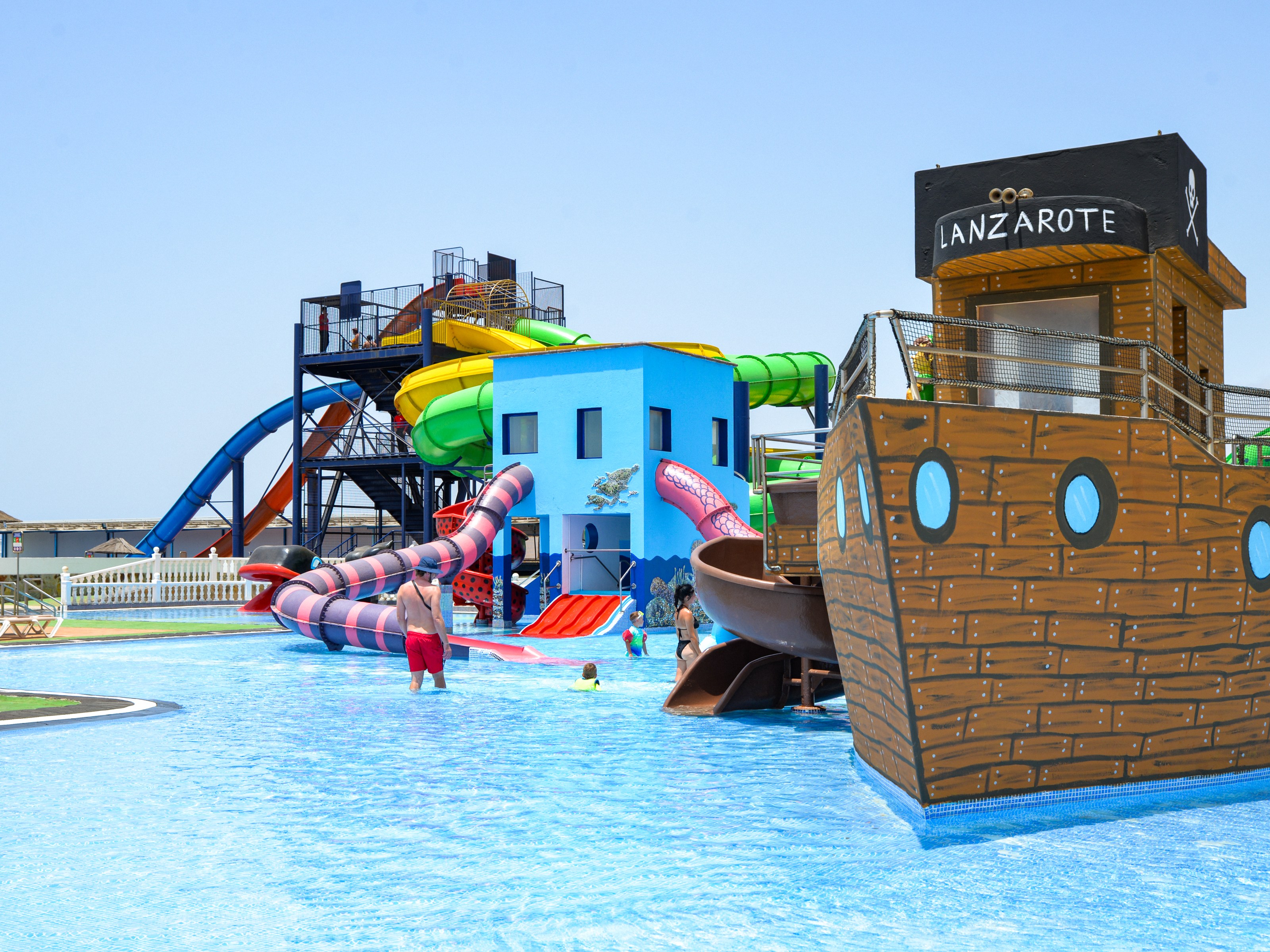 Aquapark Costa Teguise logo with a cartoon duck and water splash.